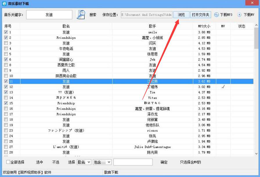 3、接下来,我们在固乔视频助手的界面中,便可以看到想要下载的和网络歌曲相关的结果都被搜索出来了。如果网络歌曲下载后的保存路径需要更改,就点击“浏览”按钮。