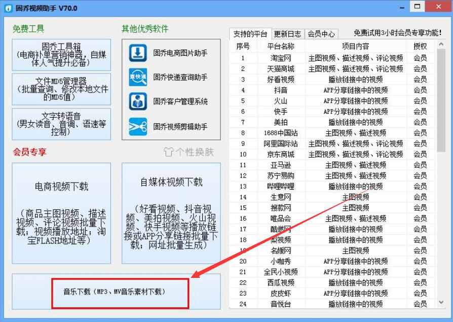 1、首先,我们打开固乔视频助手。在其操作界面中,我们点击“音乐下载(MP3、MV音乐素材下载)”功能选项。