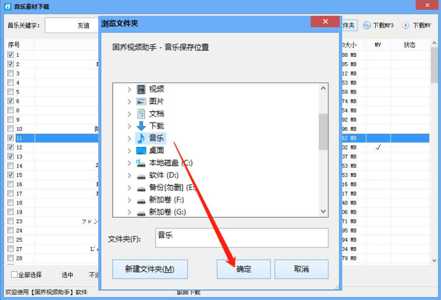 4、此时,固乔视频助手便会弹出浏览文件夹的窗口。我们选择网络歌曲下载后的保存路径,再点击“确定”按钮。