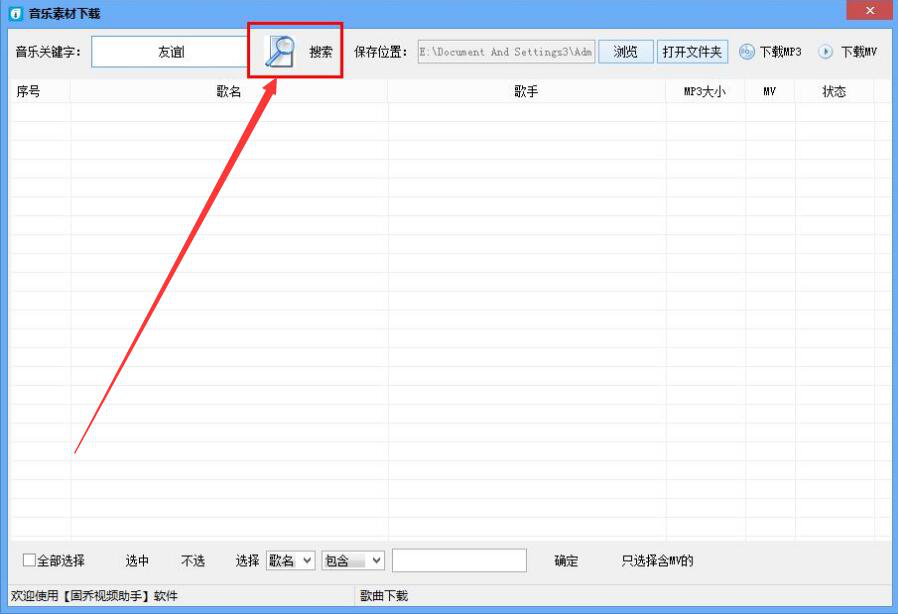 2、然后,进入固乔视频助手的音乐素材下载操作界面。我们在搜索框中输入想要下载的网络歌曲的关键字,再点击“搜索”按钮。