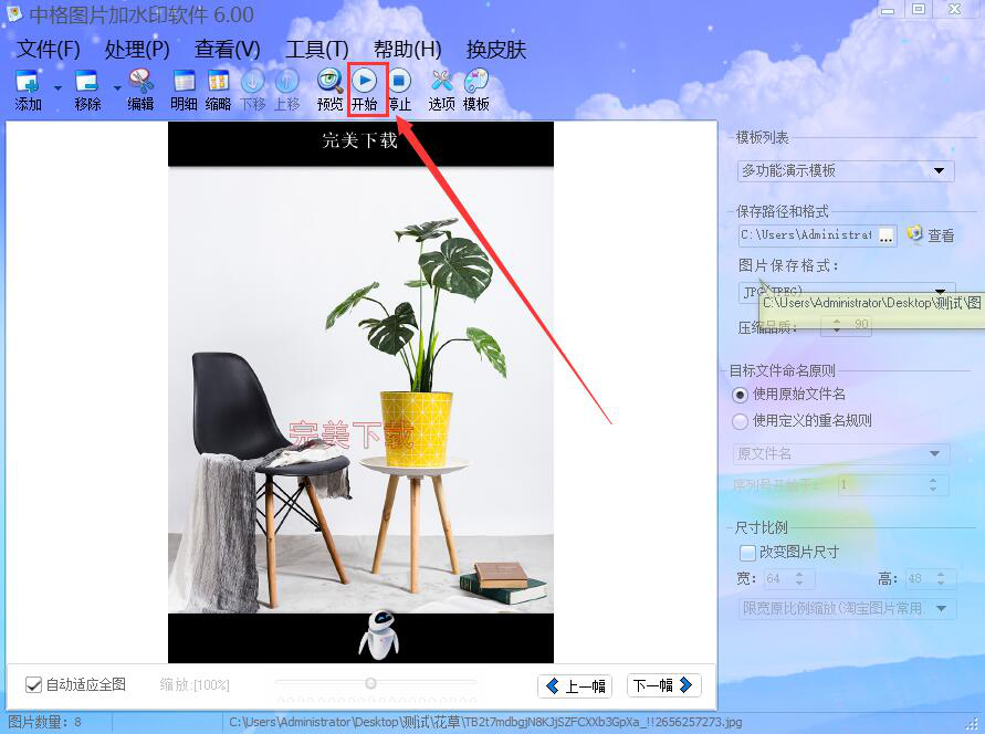 8、最后,我们点击功能栏中的“开始”按钮,中格图片加水印软件便开始为图片批量添加水印。完成之后,会自动打开图片的保存路径,从而查看图片的处理效果。