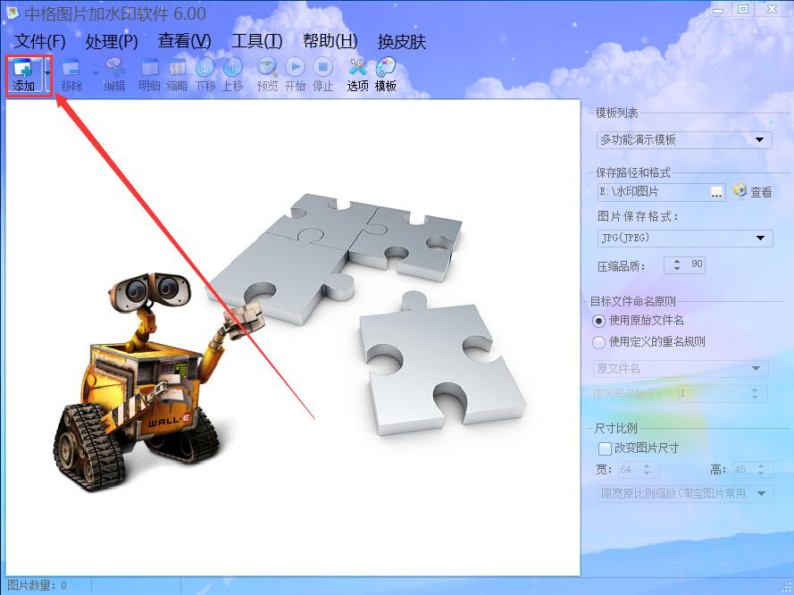 1、首先,我们打开中格图片加水印软件,点击界面左上方的“添加”按钮。