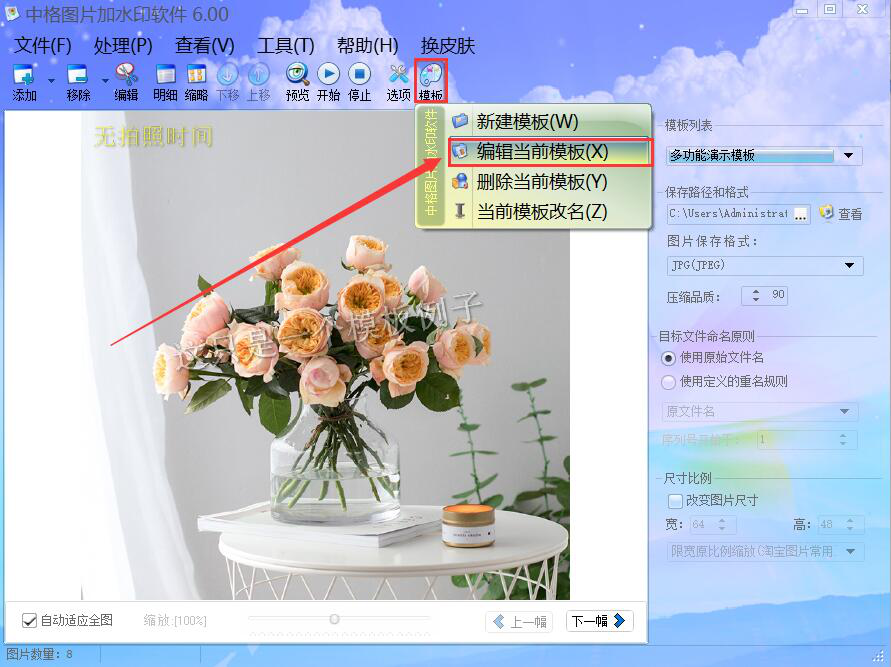 5、接下来,我们在中格图片加水印软件右侧界面中选择水印模板,再点击功能栏“模板”中的“编辑当前模板”选项。