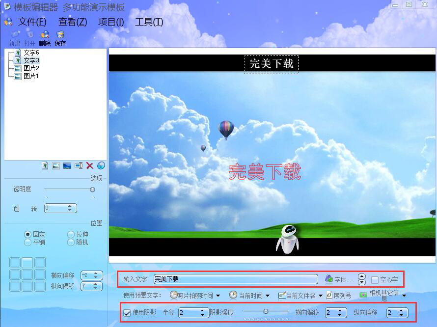 6、进入中格图片加水印软件的模板编辑器操作界面,我们根据自己的需要设置水印的文字内容、格式、位置等等,如下图所示。