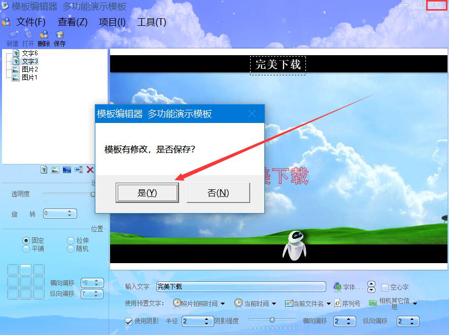7、给图片批量添加的水印的模板编辑好了后,我们点击界面右上方的“×”关闭按钮,便会弹出如下图的窗口提示,我们直接点击“是”按钮,将模板保存。