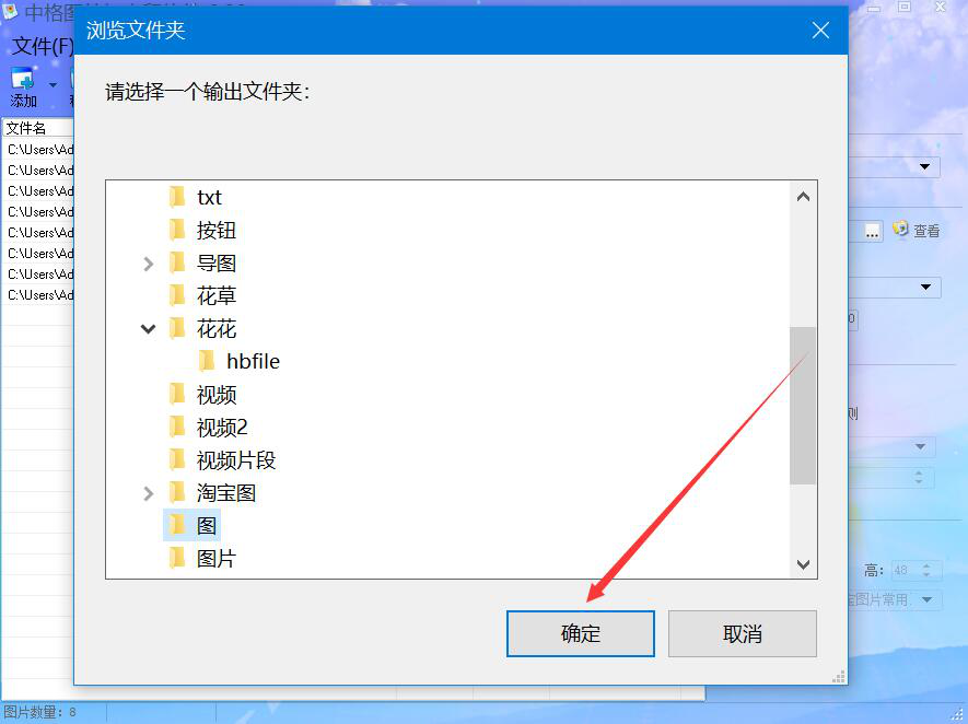 4、此时,中格图片加水印软件便会弹出浏览文件夹的窗口,我们选择批量添加了水印后的图片的输出文件夹,再点击“确定”按钮。