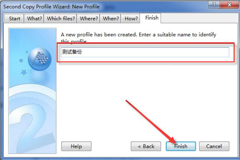 9、完成了定时备份文件目录、路径、方式的设置,我们进入Second Copy的“Finish”选项卡,命名定时备份文件的任务,再点击“Finish”按钮。