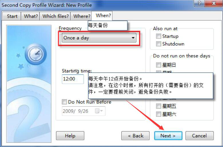 6、定时备份文件的路径设置完成后,我们进入Second Copy的“When”选项卡,我们根据自己的需要设置定时备份文件的频率、具体备份的时间,再点击“Next”按钮。