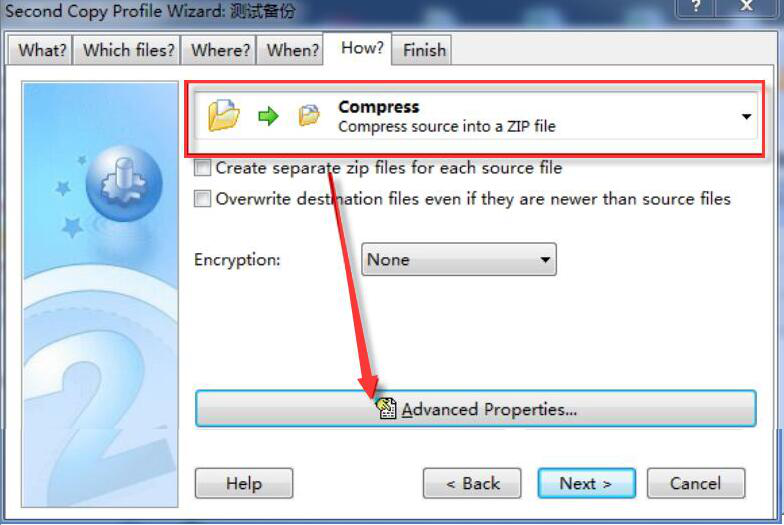 7、定时备份文件的时间和频率设置好了后,我们来到Second Copy的“How”选项卡,选择压缩的方式,并点击“Advanced Properties”高级属性按钮。