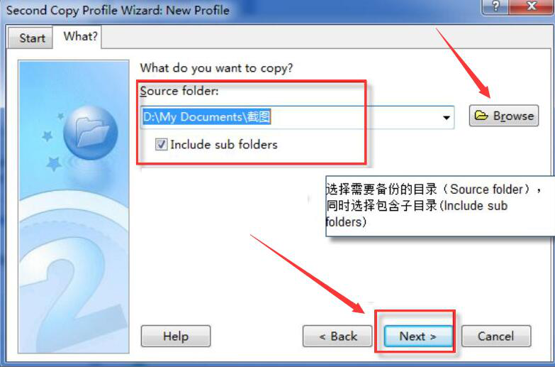 3、然后,进入Second Copy的“What”选项卡,我们点击“Browse”按钮选择需要定时备份的文件,同时勾选“Include sub folders”包含子目录选项,再点击“Next”按钮。