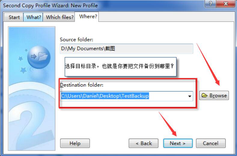 5、接下来,我们在Second Copy的“Where”选项卡中,点击“Browse”按钮选择定时备份文件的保存路径,再点击“Next”按钮。