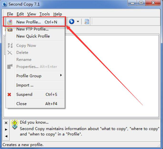 1、首先,我们打开Second Copy软件,点击“File”菜单中的“New Profile”选项,创建新的备份任务。