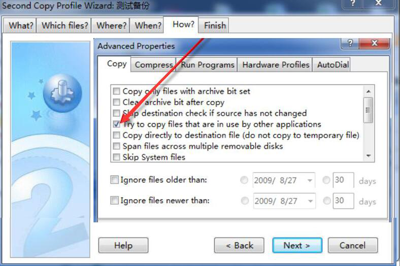 8、在Second Copy弹出的窗口中,我们勾选“Try to copy files that are in use by other applications”这个选项,尝试复制正在使用中的应用文件。