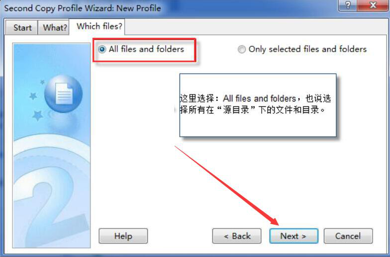 4、选择完需要定时备份的文件后,我们来到Second Copy的“Which files”选项卡,点选“All files and folders”选项,再点击“Next”按钮。