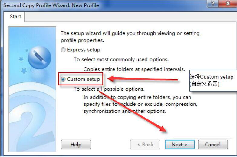 2、由于,我们是要用Second Copy创建定时备份任务,因此,在“Start”选项卡中,我们点选“Custom setup”自定义设置类型,再点击“Next”按钮。