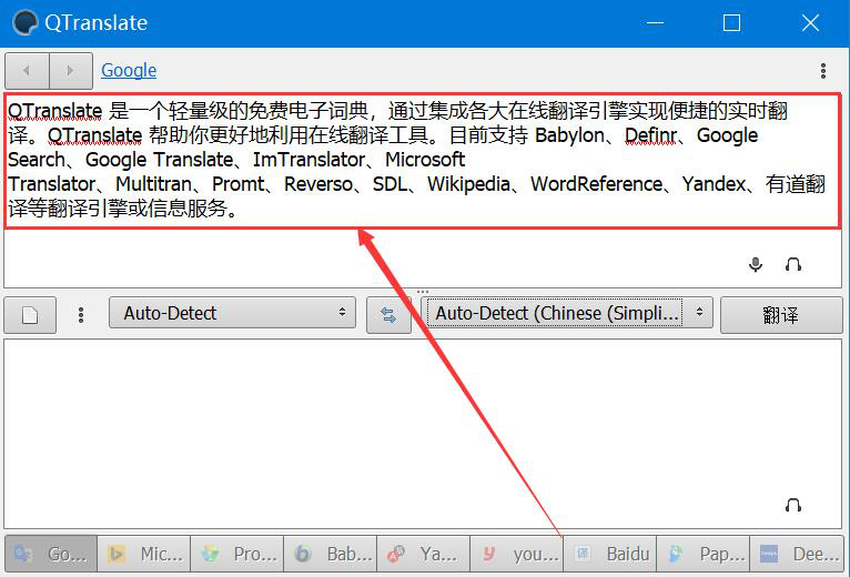 2、然后,我们将需要翻译成英文的中文内容复制粘贴到QTranslate的文本框中,如下图。