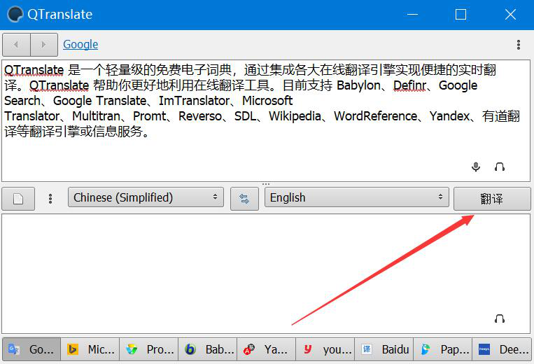 4、中文翻译成英文的语言设置好了,我们点击QTranslate界面右侧的“翻译”按钮。