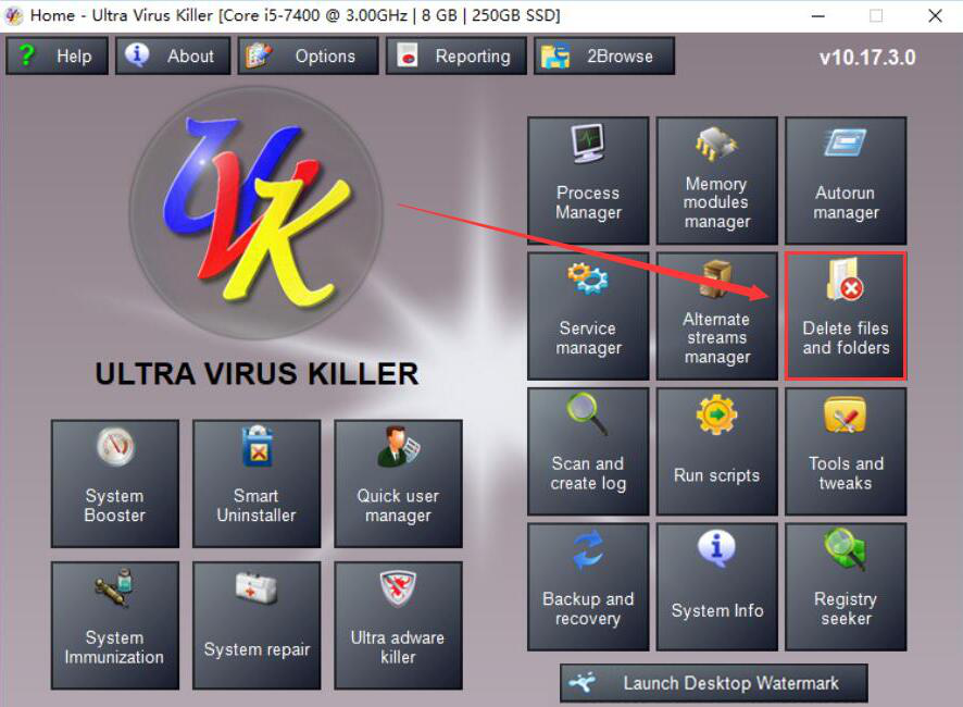 1、首先,我们打开UVK Ultra Virus Killer,在其功能向导页面中,点击“Delete files and folders”删除文件和文件夹选项。