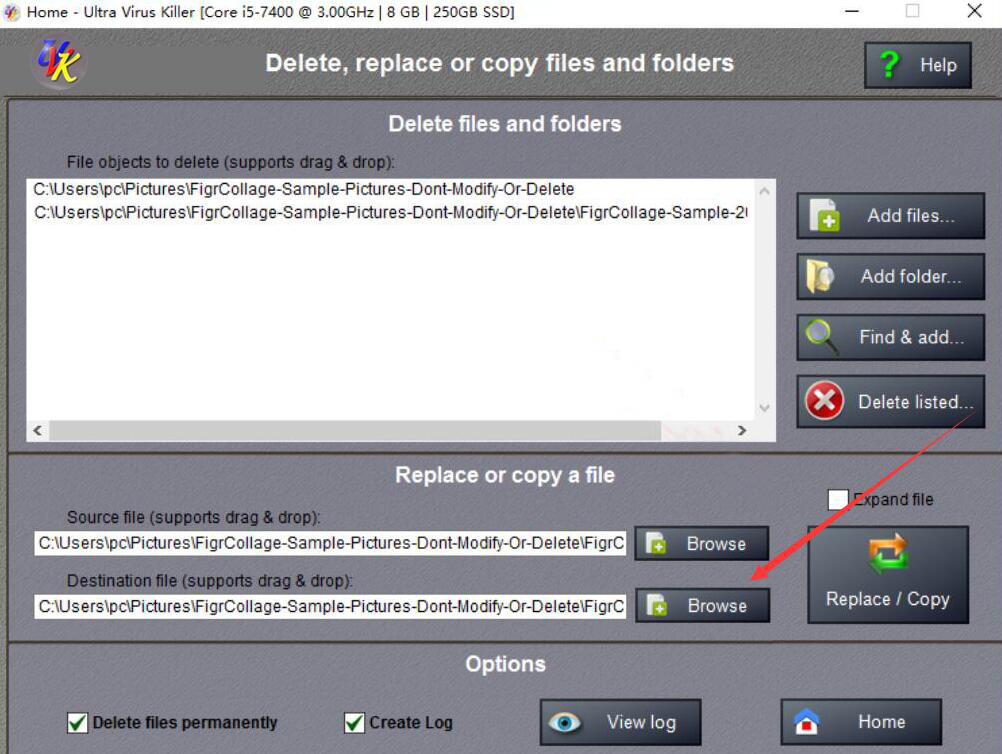 6、再次回到UVK Ultra Virus Killer操作界面,点击“Destination file”目标文件中的“Browse”浏览按钮。