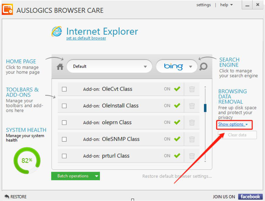 2、然后,当浏览器的缓存扫描完成了,我们可以在Auslogics Browser Care界面中了解到具体的缓存信息,点击界面右侧的“Show options”显示选项。