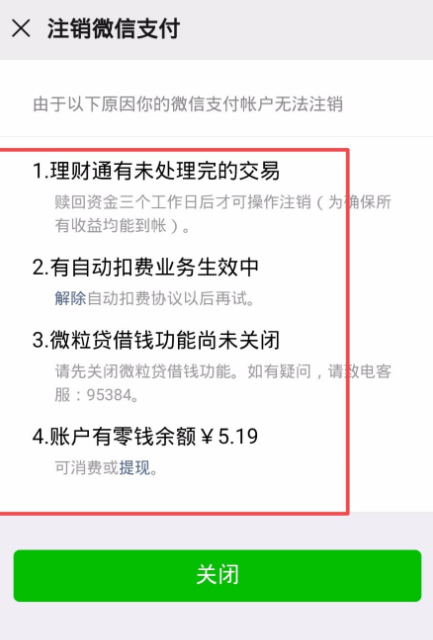 如图,软件提示无法注销微信支付账户,你需要完成所有未处理事项,才能成功注销微信支付。