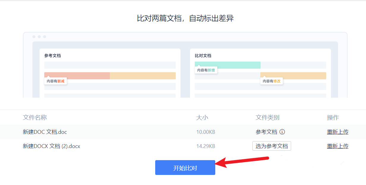 如图,点击【开始对比】,软件即可自动比较文档,并且标记所有差异。