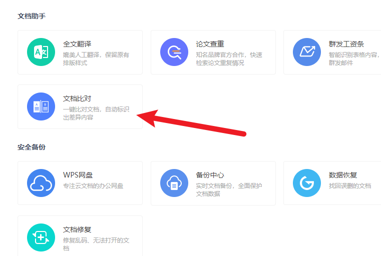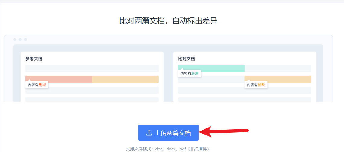 跳转至新的界面,点击【文档比对】功能,进入窗口,如图,点击【上传两篇文档】,WPS支持doc、docx、pdf格式文件,