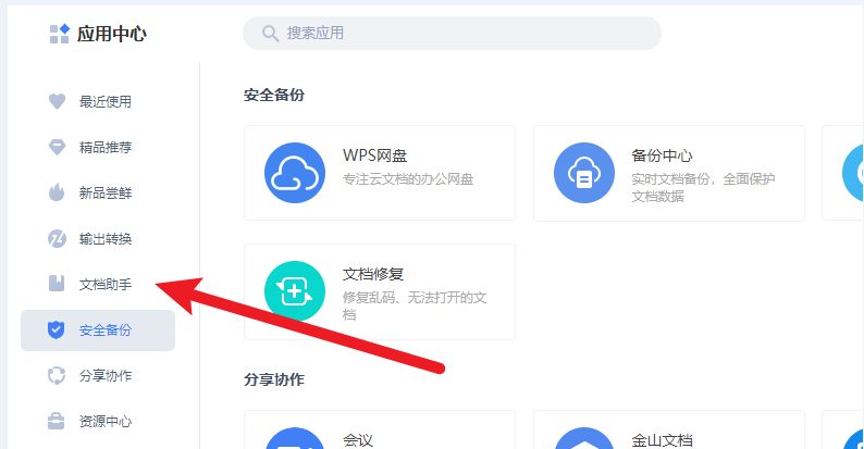进入应用中心,如图,在左侧菜单栏点击【文档助手】服务功能,