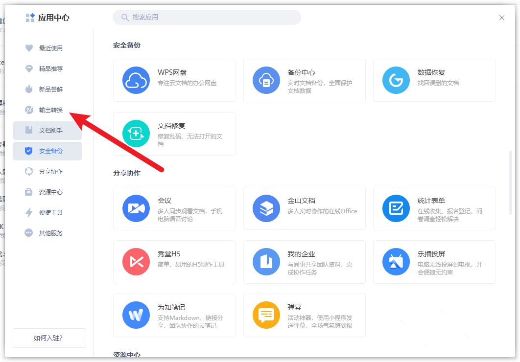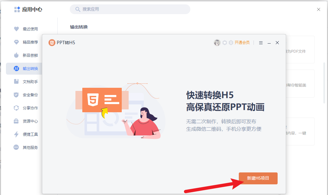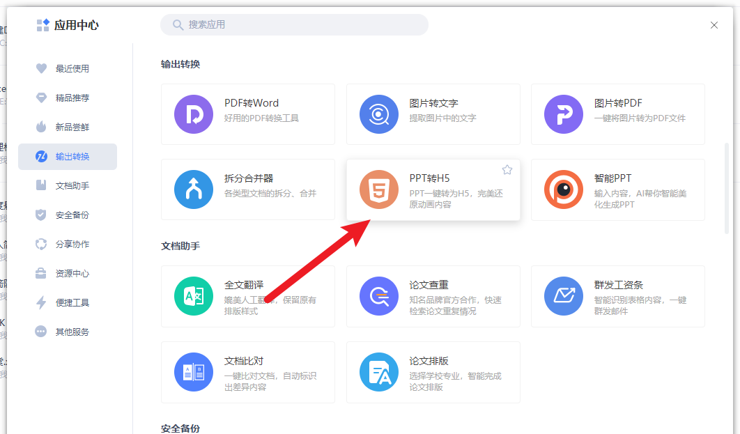 进入应用中心,如图,在左侧栏点击【输出转换】选项,选择【PPT转H5】功能,