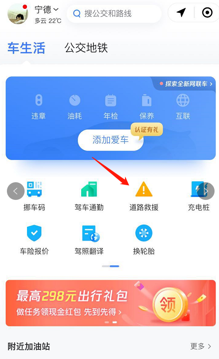 打开出行服务功能,跳转页面,如图,点击【道路救援】,