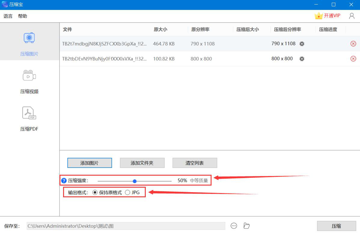 3、然后,我们回到压缩宝的压缩图片操作界面,调整压缩强度和选择输出格式,如下图所示。