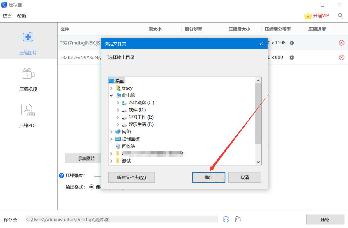 5、此时,压缩宝会弹出浏览文件夹窗口,我们选择图片批量压缩后的保存路径,再点击“确定”按钮。