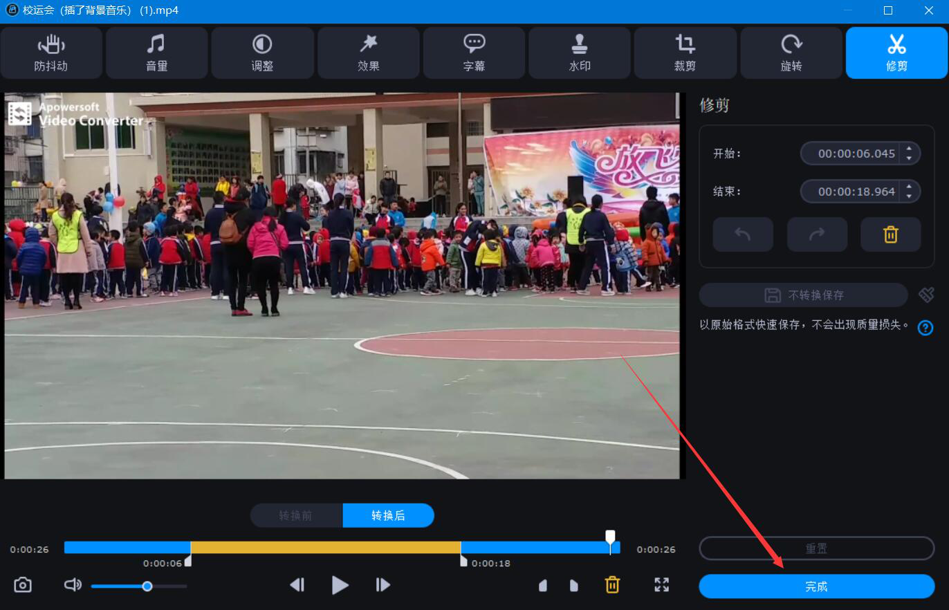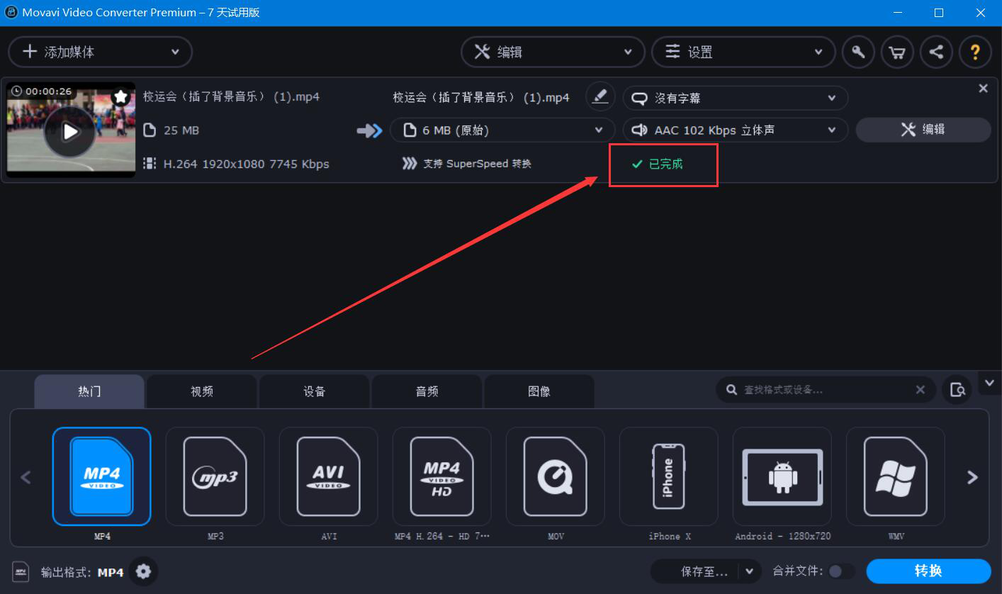 9、最后,当视频中显示“已完成”,则说明Movavi Video Converter完成视频剪切并将其保存起来了。