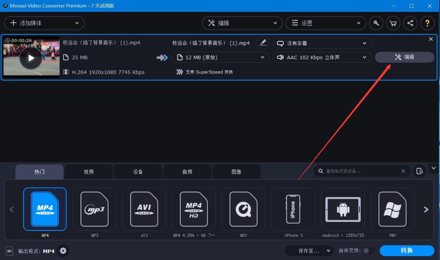3、然后,我们回到Movavi Video Converter软件界面,点击视频中的“编辑”按钮。