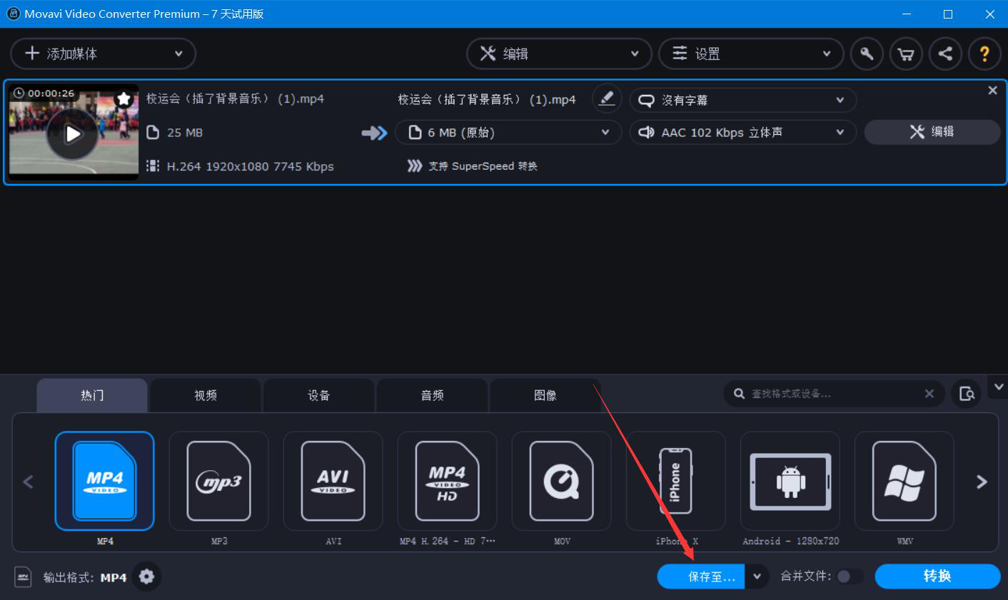 6、接下来,我们回到Movavi Video Converter的主界面,点击“保存至”按钮。