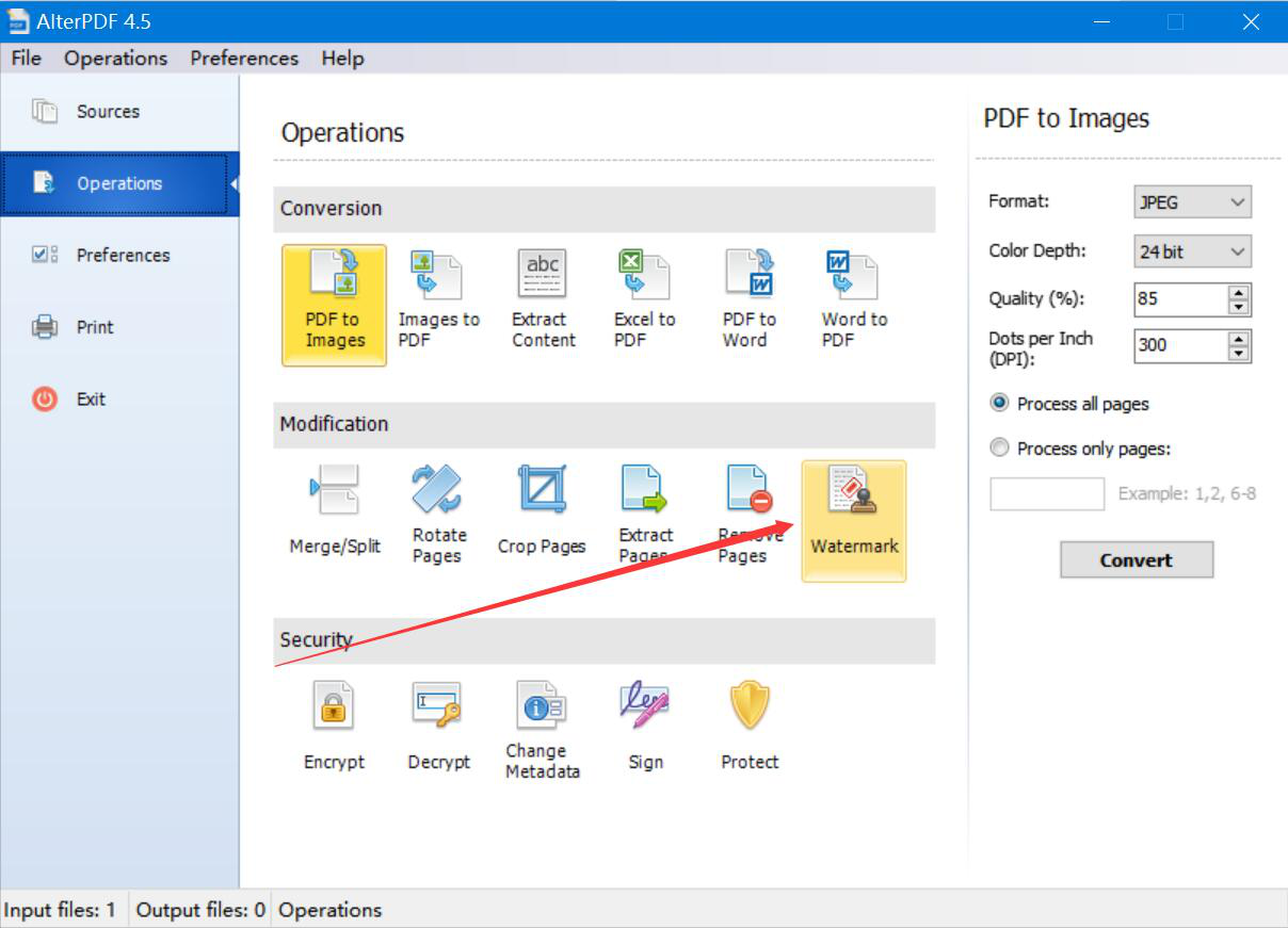3、然后,切换至AlterPDF的“Operations”操作界面,在众多功能中,我们点击“Watermark”水印选项。