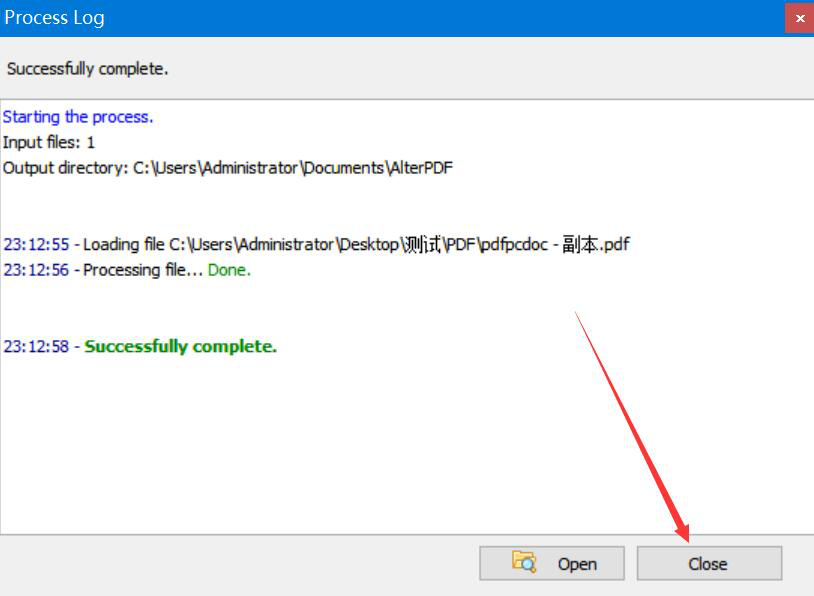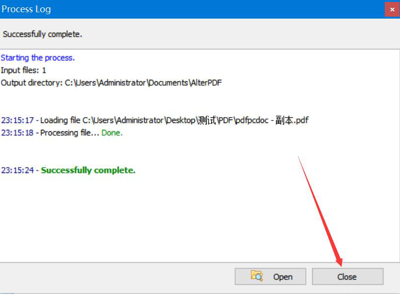 9、最后,如果弹出的进度窗口显示“Successfully complete”,则说明AlterPDF成功地为PDF文件添加了图片水印,我们点击“Close”按钮即可。