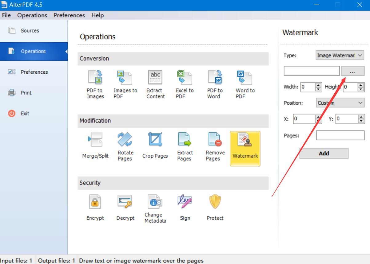 6、除了可以用AlterPDF给PDF文件添加文字水印,我们也可以添加图片水印。回到Watermark设置,选择“Image Watermark”类型,并点击如下图的“…”按钮。