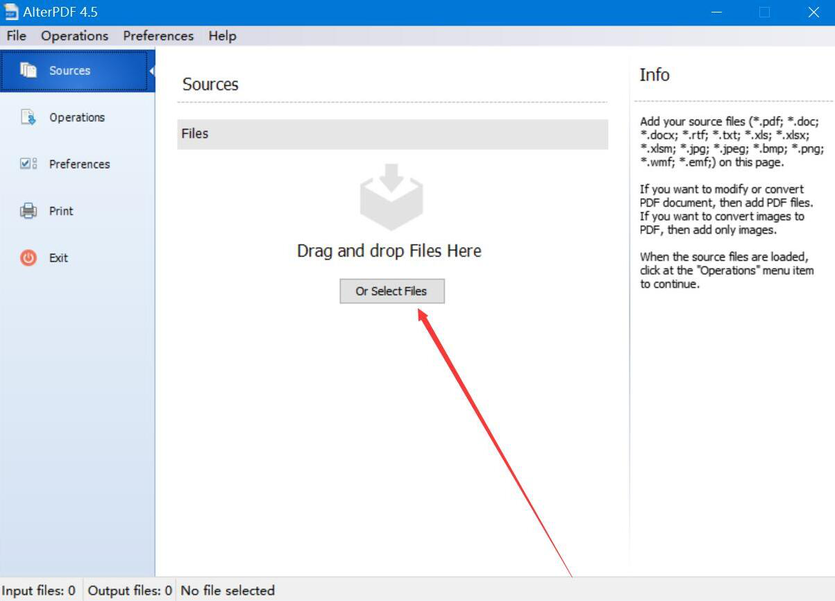 1、首先,我们打开AlterPDF软件,先切换至“Sources”操作界面,并点击界面中部的“Or Selece Files”按钮。