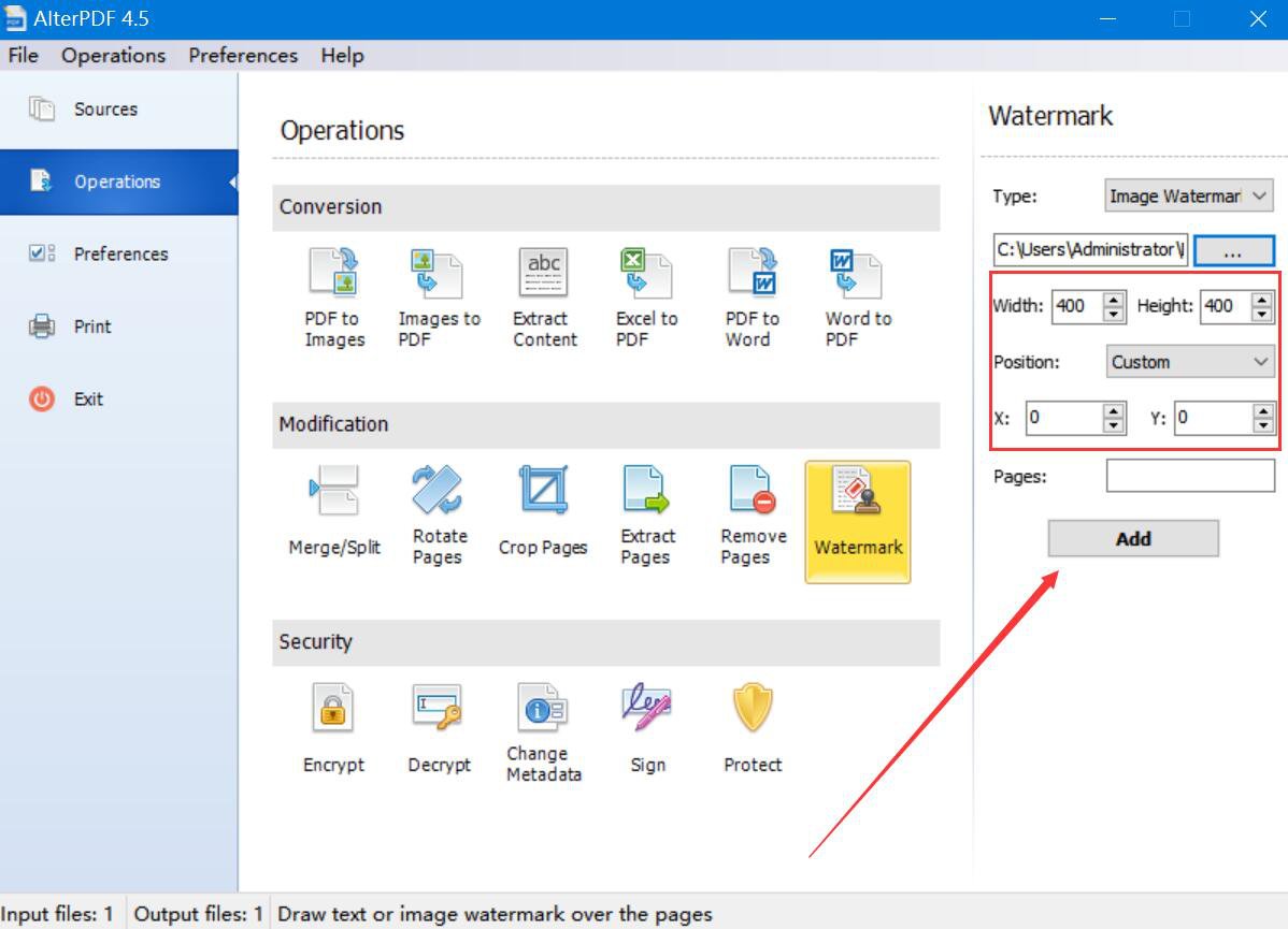 8、我们继续回到AlterPDF的Watermark设置,可以设置图片水印的大小和位置,再点击“Add”按钮,AlterPDF便开始给PDF文件添加图片水印。