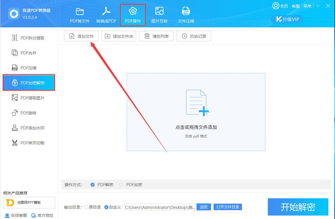 1、首先,我们打开我速PDF转换器,切换至“PDF操作”菜单中的“PDF加密解密”操作界面,并点击界面左上方的“添加文件”按钮。