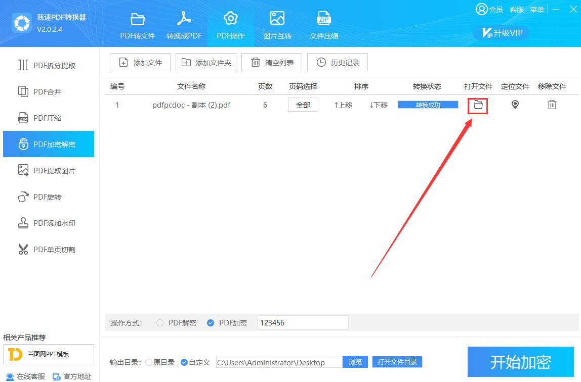 7、最后,当转换状态显示“转换成功”,则说明我速PDF转换器成功加密了PDF文件。我们点击如下图的文件夹图标按钮,即可快速找到加密后的PDF文件。