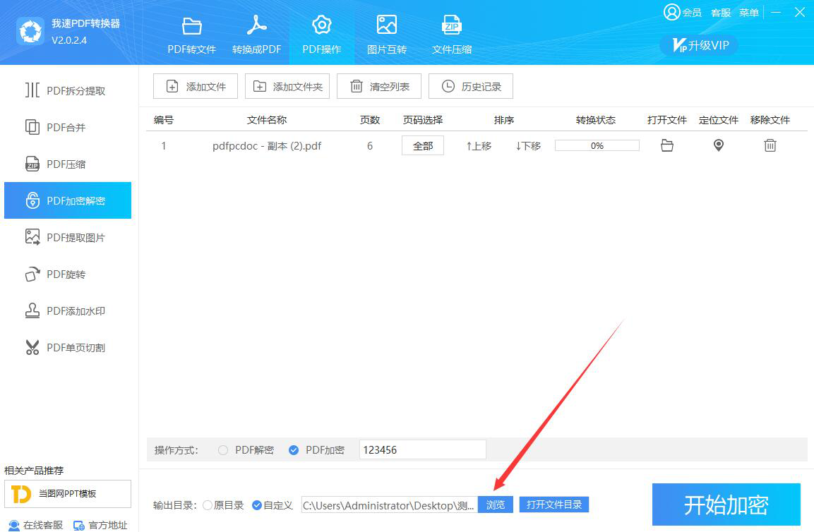 4、如果PDF文件加密后的输出目录需要更改,就点击我速PDF转换器界面下方的“浏览”按钮。