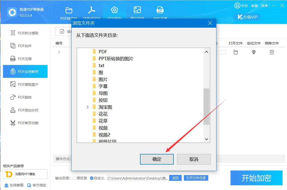 5、接下来,我们在我速PDF转换器弹出的浏览文件夹窗口中,选择PDF文件加密后的保存路径,再点击“确定”按钮。
