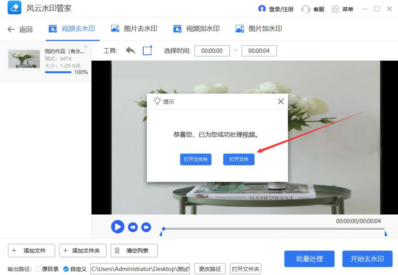 8、最后,弹出如下图的窗口提示,则说明风云水印管家将视频的水印成功地去除了。我们点击“打开文件”按钮,即可快速找到处理好的视频。