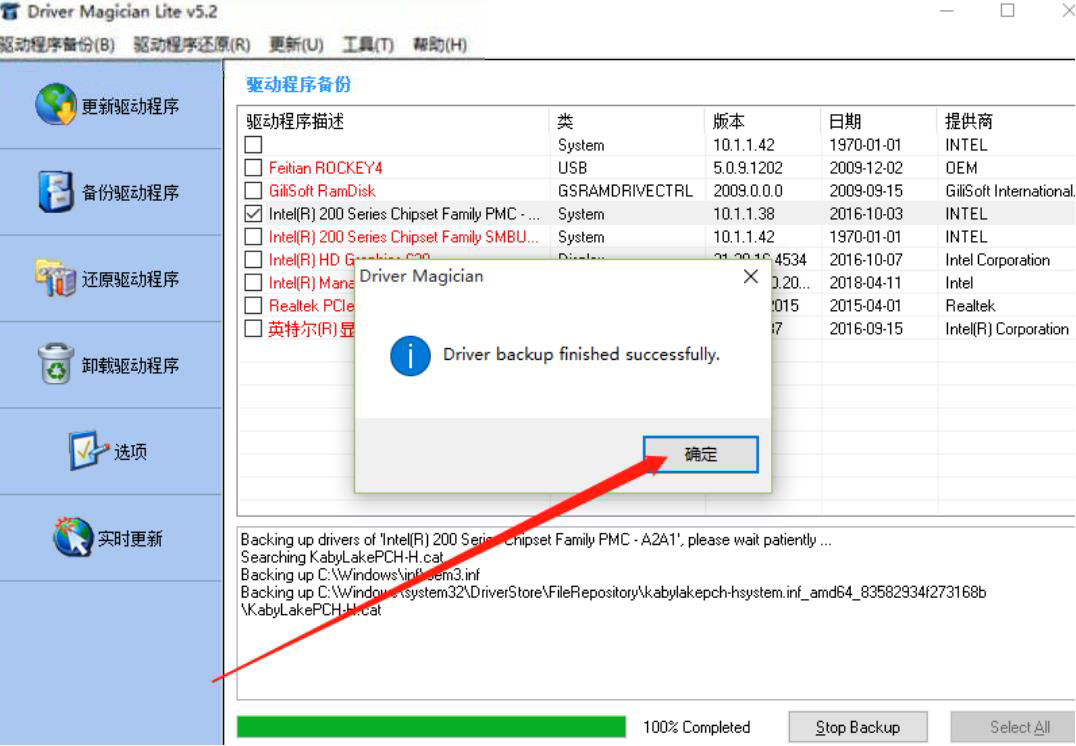 4、当弹出如下窗口时,则说明Driver Magician Lite已经将驱动程序备份好了,我们直接点击“确定”按钮即可。