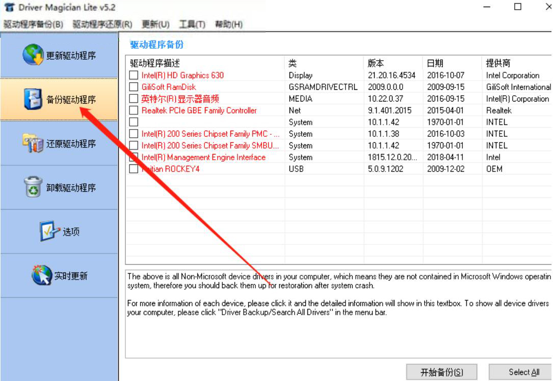 2、然后,在Driver Magician Lite界面中,我们勾选自己想要备份的驱动程序,再点击界面右下方的“开始备份”按钮。