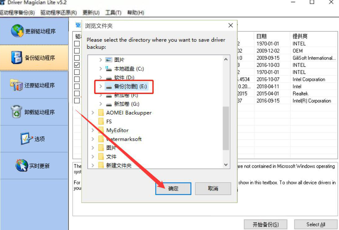 3、接下来,Driver Magician Lite会弹出浏览文件夹窗口,我们选择驱动程序备份后的保存路径,再点击“确定”按钮。