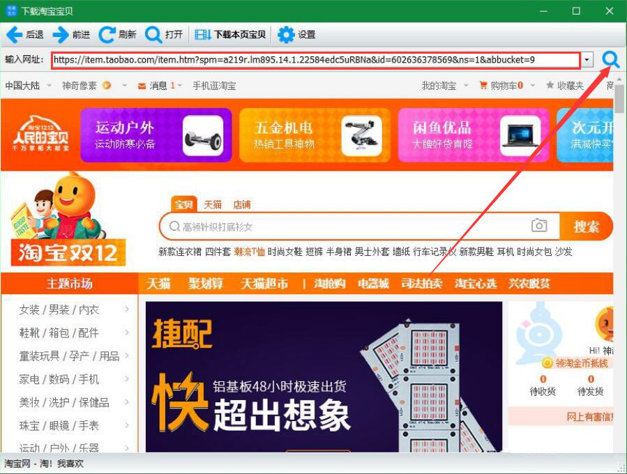 2、然后,我们将需要下载的淘宝宝贝链接复制粘贴到输入网址的地址框,再点击它旁边的搜索按钮。
