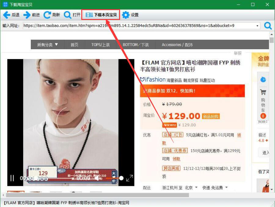 3、接下来,神奇电商宝贝下载软件便会自动识别并跳转至要下载图片的宝贝详情页。我们点击界面上方的“下载本页宝贝”按钮。
